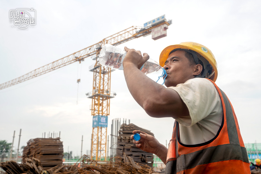 2024年5月13日,海南临空航空特货“超级运营人”项目工人在喝水休憩。